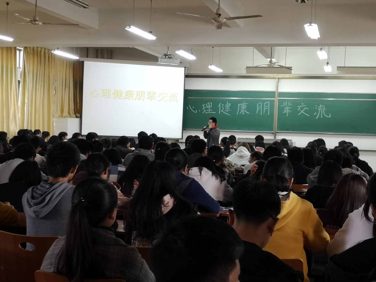 2018级学生在六栋210教室召开心理健康朋辈交流主题大会,交流由兼职辅导员方派主持。就开学以来同学们相处时发生的一些问题,方派做出总结,并提出解决建议。