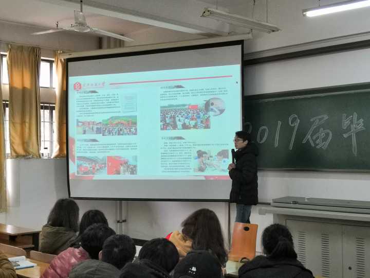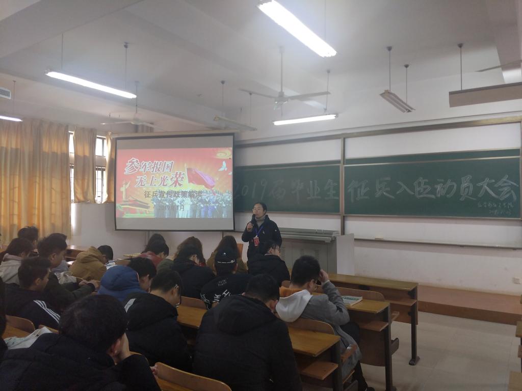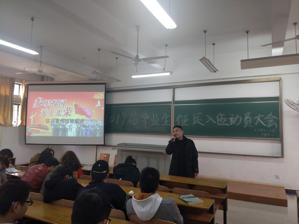 征兵联络员谈鹏老师组织召开了“投身军旅,绽放青春”2019届毕业生征兵动员大会,同时邀请2015级应征入伍并复员学生吴泽平出席此次大会并组织退伍士兵朋辈交流活动。