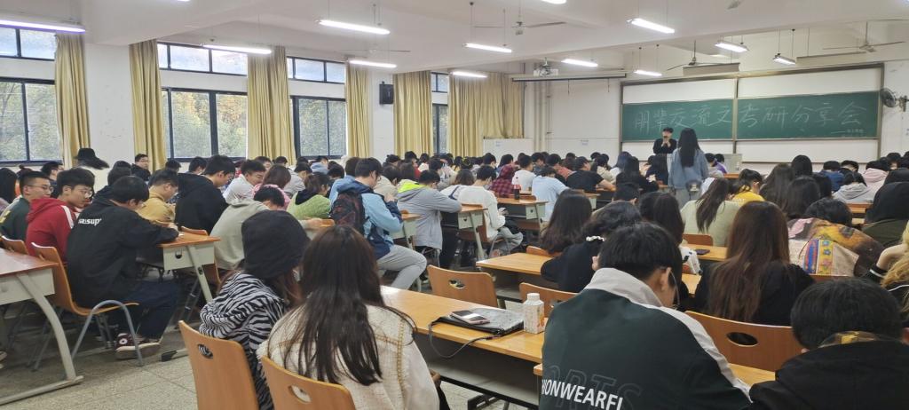 在崇礼楼210教室,开启本学期“朋辈说”系列活动第二期,研究生杨铭和2018级同学分享考研经验。