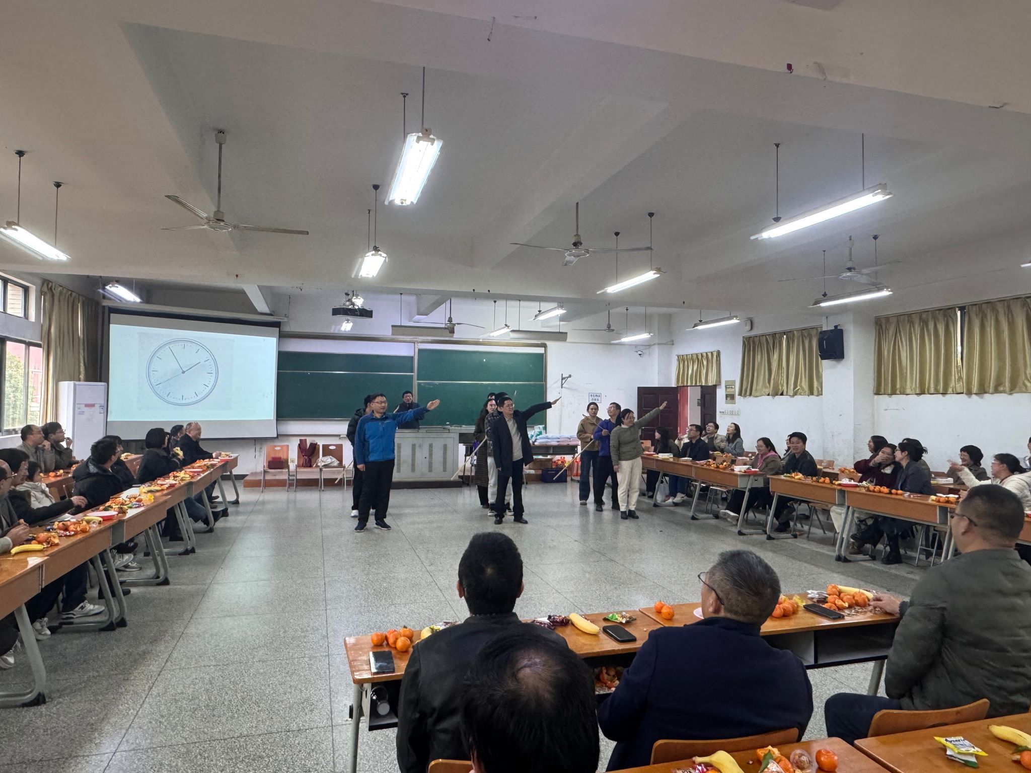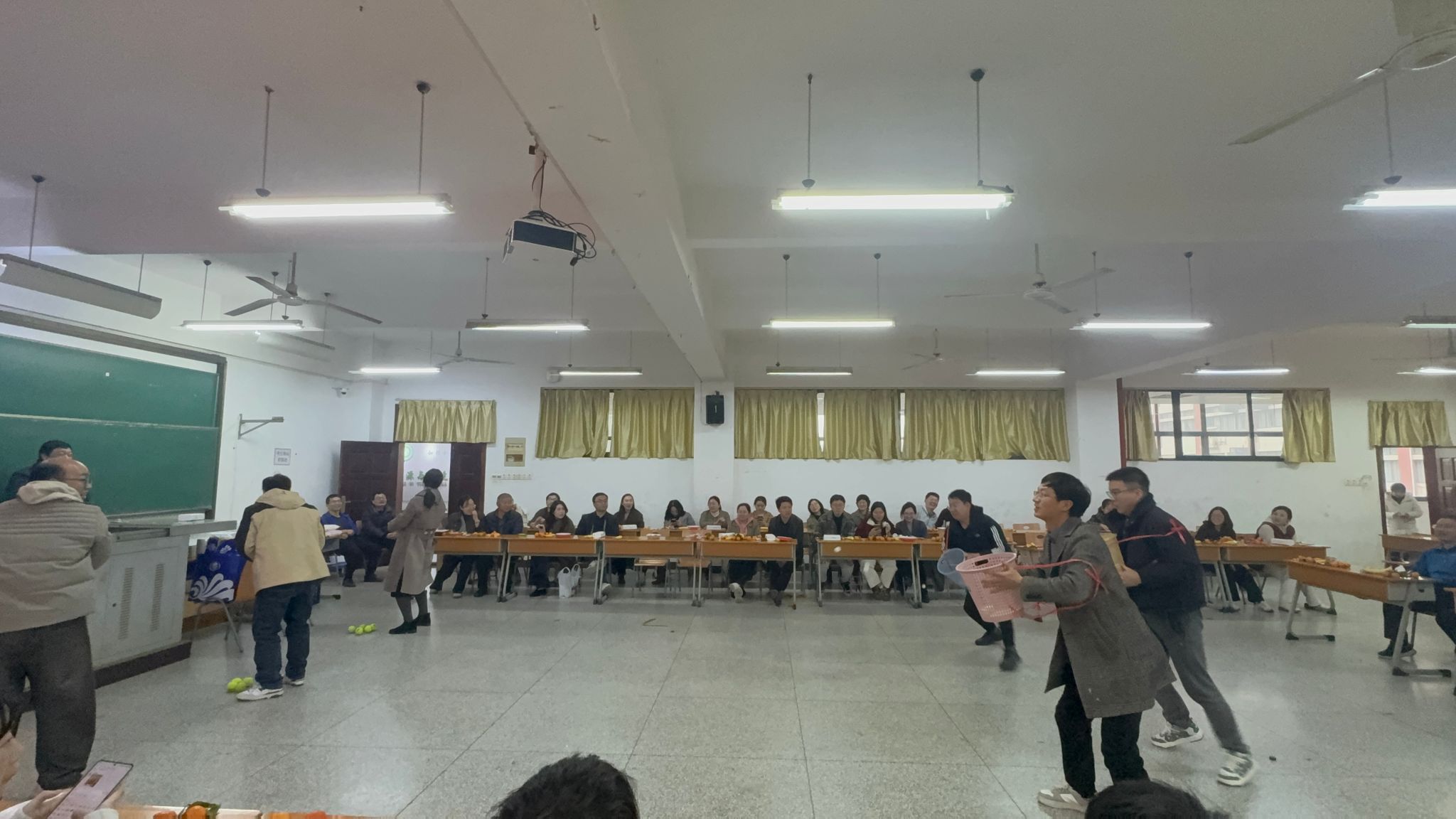 工会精心策划组织了一系列兼具趣味性与互动性的活动,让现场氛围迅速升温。茶话会以“欢乐相聚·共启新程”为主题,设置了幸运抽奖、“扮时钟、抛锈球、五毛一块、学习武汉话”等多个趣味活动环节。幸运抽奖环节中,各种精美礼品接连送出,每次开奖都伴随着阵阵欢呼与掌声;趣味游戏环节更是精彩纷呈,“扮时钟”游戏中,参赛教职工精准模仿时钟指针角度,引得台下笑声不断;“抛绣球”游戏考验着团队协作与反应能力,大家相互配合、踊跃参与;“五毛一块”游戏中,教职工们快速组队、灵活调整,现场充满了欢声笑语;“学习武汉话”环节则极具地域特色,本土教师耐心教学,外地教师认真模仿,一句句略显生涩却充满趣味的武汉话让现场氛围愈发温馨融洽。茶话会现场摆满了水果、点心,教职工们边品尝边参与活动,畅谈工作与生活,处处洋溢着团结奋进、喜庆祥和的节日气氛。