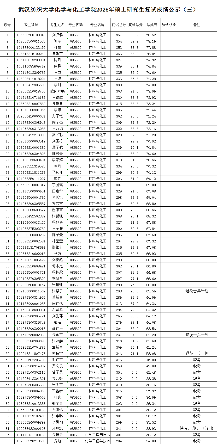 公示时间:2026年4月9日-11日。如对公示成绩有异议,在公示期内,可据实向化学与化工欧美a片 办公室反映。电话:朱老师 027-59367336