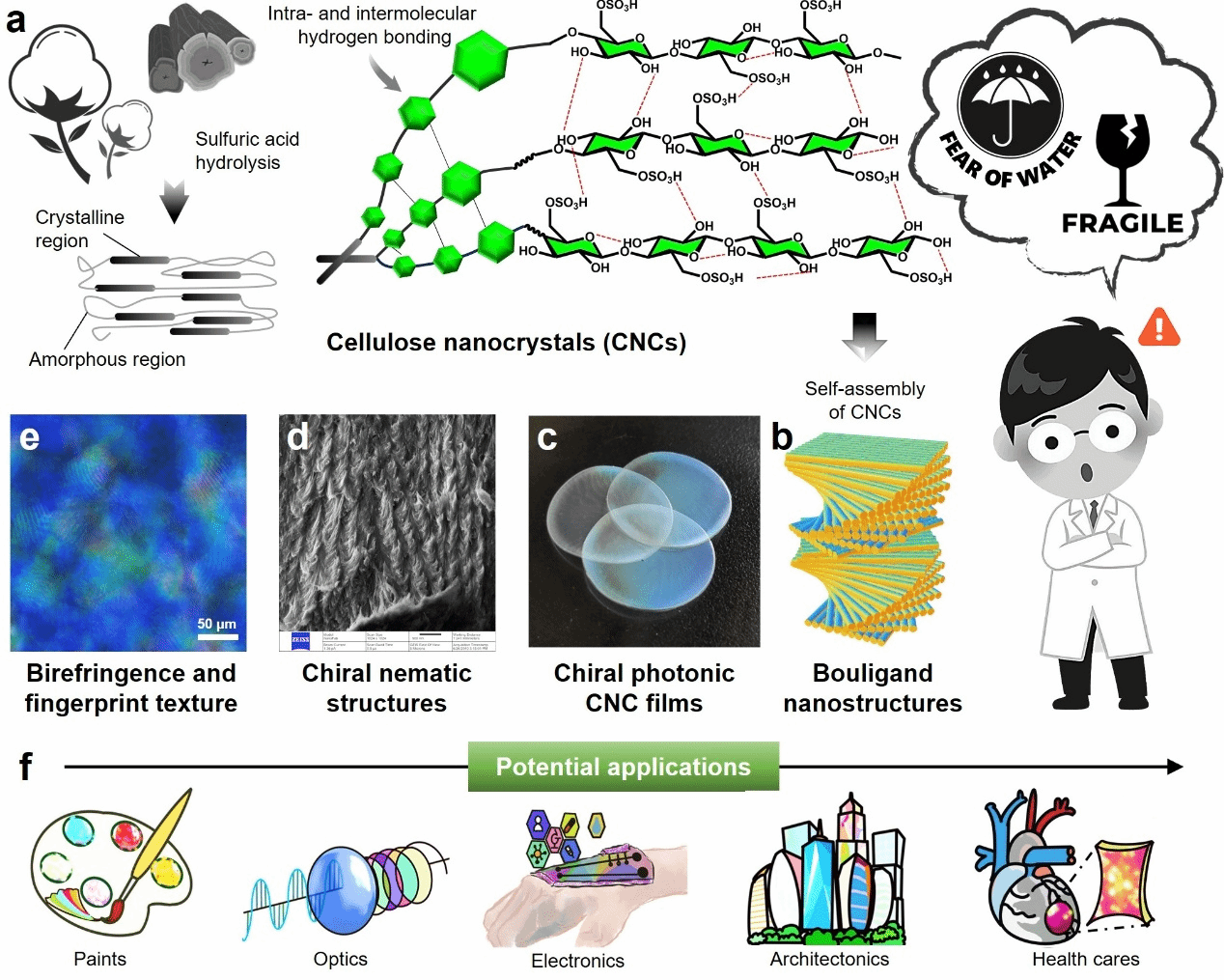 纤维素纳米晶体(CNC)作为一种绿色可再生的纳米材料,具有优异的手性光学性能与结构色效应,在光子晶体、传感器件和光学防伪等领域展现出重要潜力(图1)。然而,其固有的亲水性和力学脆性制约了其在潮湿及力学负载环境下的实际应用。本综述系统梳理了近年来通过基质工程策略提升CNC材料环境稳定性与力学性能的研究进展。
