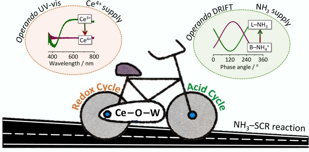 氮氧化物选择性催化还原(NH3–SCR)反应被普遍认为同时受表面酸性与金属氧化还原性能的共同调控,但二者如何在反应过程中实现动态协同,长期缺乏直接的实验证据。针对这一问题,研究团队以ZrO2为载体,在Ce/ZrO2体系中引入适量W物种,成功构建了具有紧密空间关联的Ce–O–W结构。该结构不仅显著调变了表面Brønsted/Lewis酸分布,还有效耦合了Ce的可逆氧化还原行为。