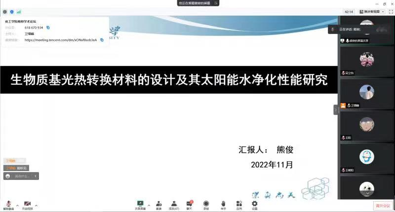 熊俊博士作了题为“生物质基光热转换材料的设计及其太阳能水净化性能的研究”的学术报告。论坛由化工系卫老师主持,欧美a片