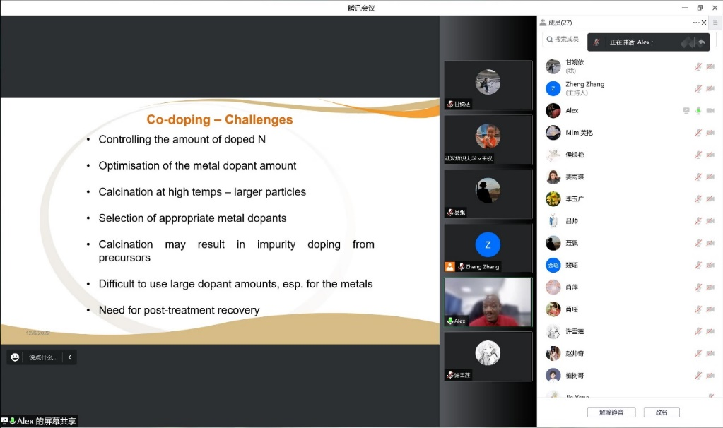 On December 6th, the 289th Sunshine Forum was held online by the School of Chemistry and Chemical Engineering. Prof. Alex Kuvarega from University of South Africa was invited to give an academic report entitled "New photocatalysts for water/wastewater treatment applications", which was chaired by Dr. Zheng Zhang. The faculty members, graduate and undergraduate representatives participated in the discussion.