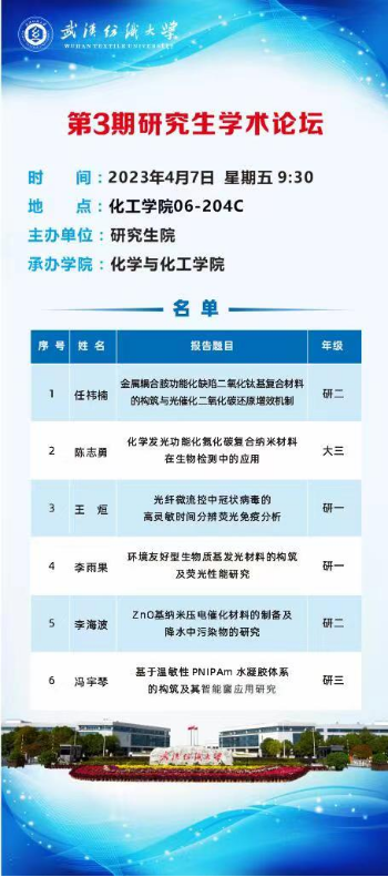 在本次学术论坛上,研究生冯宇琴、任祎楠、王煜、李雨果、李海波以及本科生陈志勇分别分享了他们在水凝胶体系、复合材料构筑、荧光免疫分析等方向的探索研究、心得和成果。讨论阶段,老师和同学们积极提问,讨论氛围热烈,研究生学术论坛的举办让同学们有更多的机会交流实验设计、思路等相关的科研经验,能更好的激发同学们的科研热情,期待同学们在未来展示出更多更好的优秀成果。
